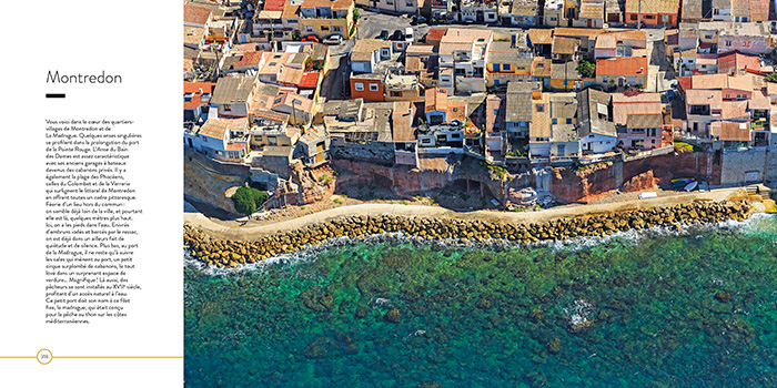 [dropcap text_color= » » background_color= »dark »]U[/dropcap]n bonhomme en bâtons, en termes de portraiture, c’est le degré zéro de l’art figuratif. Et l’administration, on en conviendra, c’est de la même manière le rez-de-chaussée de la beauté. De platitude en platitude, on en vient ainsi à établir que le littoral des Bouches-du-Rhône fait officiellement 280 km. Mais c’est un peu court, jeune homme ! C’est oublier les « caps », c’est faire fi des « péninsules » ! Et c’est bien dommage, car comme nous le montre le livre de photos de Camille et Sandrine Moirenc, si l’on change d’échelle et que l’on mesure toute la dentelle des plis rocheux, les courbes élégantes des plages et les méandres subtils des estuaires qui se perdent de marais en calanques et ajoutent au linéaire, c’est bien 438 km de côtes qu’il faudrait compter ! Ces magnifiques photos aériennes, agrémentées de portraits de gens de mer, nous offrent un très agréable road trip méditerranéen.