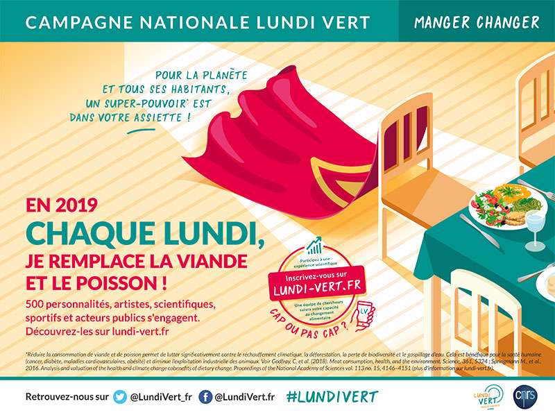 [dropcap text_color= » » background_color= »green »]C[/dropcap]e lundi 7 janvier a démarré un grand mouvement national : le « Lundi Vert » ! C’est un appel général à ne plus manger de viande, ni même de poisson, le lundi, tout simplement… Pas moins de 500 personnalités, artistes, scientifiques, sportifs et intellectuels sont signataires-initiateurs : Juliette Binoche, Isabelle Adjani, Delphine Wespiser, Frédéric Lopez, Stéphane Bern, Yann-Arthus Bertrand et tant d’autres… À Marseille et dans les Bouches-du-Rhône ce sont des scientifiques et universitaires qui se sont mobilisés en nombre et, bien sûr, Marseille Vert qui est partenaire du mouvement ! La campagne, lancée par les chercheurs Laurent Bègue de l’Université de Grenoble et Nicolas Treich de l’INRA Toulouse, reprend le modèle du « Meatless Monday » lancé dans une quarantaine de pays depuis 20 ans. Une initiative qui espère séduire 500 000 inscrits dès cette première année et c’est bien parti on dirait ! Car le mouvement est pertinent, tant il s’inscrit dans un monde en transition, en nous permettant de faire un geste très important avec des personnes pas encore prêtes à devenir végétariennes à temps plein… et qui pourtant ont des « super-pouvoirs » pour la planète. Une façon également de se rendre compte que l’on peut se nourrir autrement, sans lésiner sur le goût. Sur le site, les adhérents vont être suivis, accompagnés dans leur engagement par des scientifiques (aides, messages, recettes, etc.).