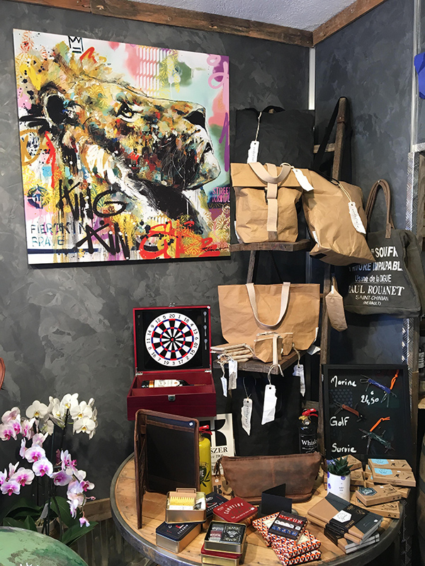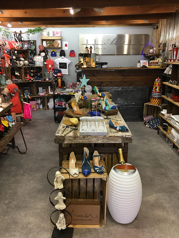 [dropcap text_color= » » background_color= »dark »]L[/dropcap]e 16 février dernier, en plein cœur du centre-ville cassiden, face au terrain de pétanque, Benjamin et Angélique Brière ont ouvert un concept-store original : Addict !  La décoration hand made et industrielle des lieux met en avant une quarantaine de marques (tous univers confondus) avant-gardistes, originales, de qualité et pratiquement toutes locales (chaussures Créatis, les bijoux de Barbara…). Dans cette immense caverne stylée, on peut trouver du linge de maison mais également du rhum Ferroni, des objets connectés et la collection des Déglingos pour enfants. Vous l’aurez compris, dans ce charmant bric-à-brac, il n’y a pas de règle, sinon celle de la fantaisie ! Entrez dans le monde fantastique de Benjamin et Angélique et ressortez avec les sacs remplis de nouveautés décalées pour toutes les bourses, de 1,50 € la lime à ongles à 1 645 € le canapé-voiture…