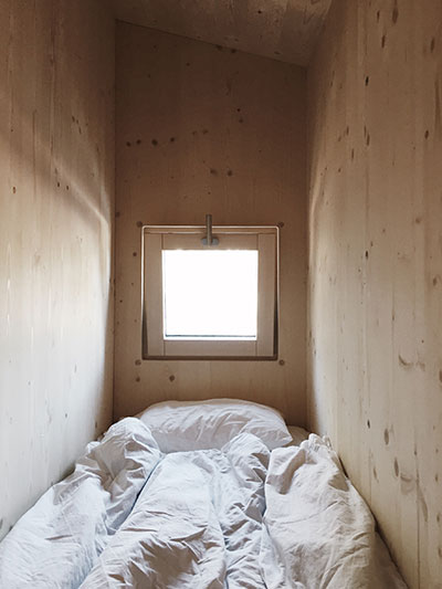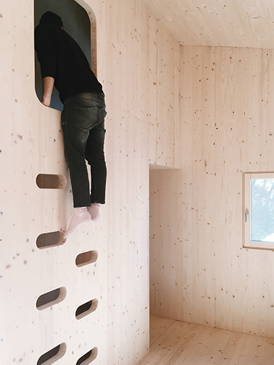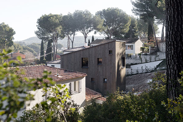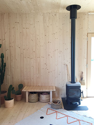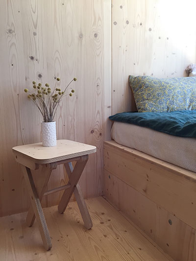Petit luxe, tout est réalisé sur mesure, depuis les panneaux extérieurs jusqu’au mobilier intérieur. Pour cette prouesse, Alexandre a rejoint le studio d’architecture et de design Atelier ordinaire, avec qui il crée désormais d’autres maisons de bois en Provence. L’idée fait peu à peu son chemin ici, les prochaines seront bâties à Venelles et Aix-en-Provence… Des maisons belles et sobres qui parlent d’avenir : elles sont construites sur pilotis métalliques, aussi le terrain est-il le moins dénaturé possible. Pas de béton, tous les matériaux peuvent être démontés et recyclés. Alexandre nous révèle ensuite que sa maison ne dispose pas de système de chauffage. Imaginez une boîte dans une boîte, entre les deux se glisse un matériau isolant ignifugé, en fibre de bois, rigide et léger à la fois. Seul le poêle vient en appoint pour les jours de grand froid… Quelle chance ont Daphné et Noée ! Quel enfant n’a jamais rêvé d’une cabane aussi douillette !?