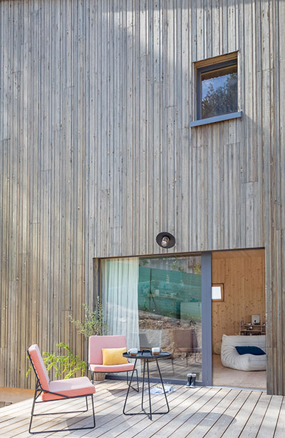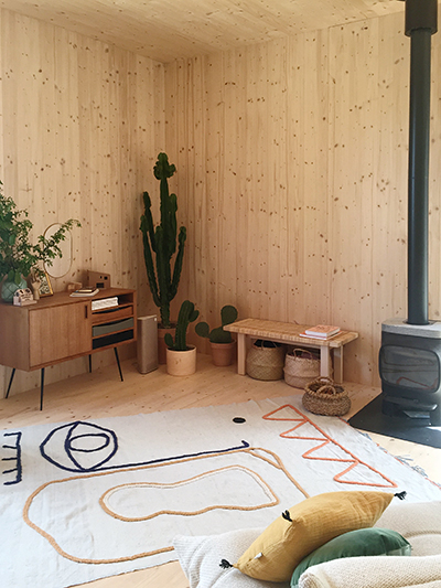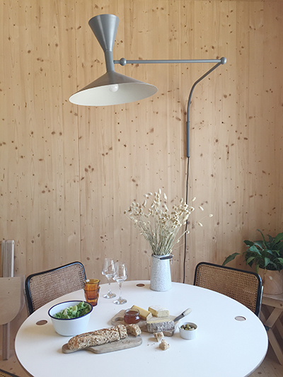 Libérez-vous des images de chalet savoyard ou d’isba russe. La « cabane », comme l’appelle Daphné du haut de ses presque 4 ans, est un habitat en bois aux lignes tout à fait contemporaines. Le bâtiment s’intègre parfaitement à l’environnement de pinèdes qui borde le village et la décoration intérieure y est épurée, un brin scandinave. « J’apprécie beaucoup le bois », explique Alexandre. « C’est une matière écologique agréable et facile à travailler. J’aime utiliser des matériaux non transformés. Le bois brut est très chaleureux, on se sent bien chez nous. J’élabore en ce moment une collection de luminaires et de meubles qui marient le bois et la céramique. Du brut, toujours ! », ajoute-t-il.