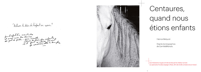 [dropcap text_color= » » background_color= »dark »]C[/dropcap]entaure, chimère moitié homme, moitié cheval. Centaures, quand nous étions enfants, spectacle théâtral équestre… et objet lui-même hybride ! Aussi, c’est sous la forme d’un livre tête-bèche, une moitié consacrée à de magnifiques photos, l’autre au texte du spectacle (signé Fabrice Melquiot), que se présente cet ouvrage infiniment soigné. Devant cette attention portée aux détails et à la finesse sous toutes ses formes, on pourrait même aller jusqu’à le dire « chéri par ses créateurs », comme un doux souvenir d’enfance. Et c’est bien à l’image de l’histoire qui nous est contée par Camille et Manolo : celle de leur rencontre à eux, celle de leur rencontre avec leur moitié cheval respective et celle, en définitive, de la création à Marseille du Théâtre du Centaure. Une œuvre poétique en forme de défi aux mathématiques, la démonstration subtile que parfois, 1+1 = 1.