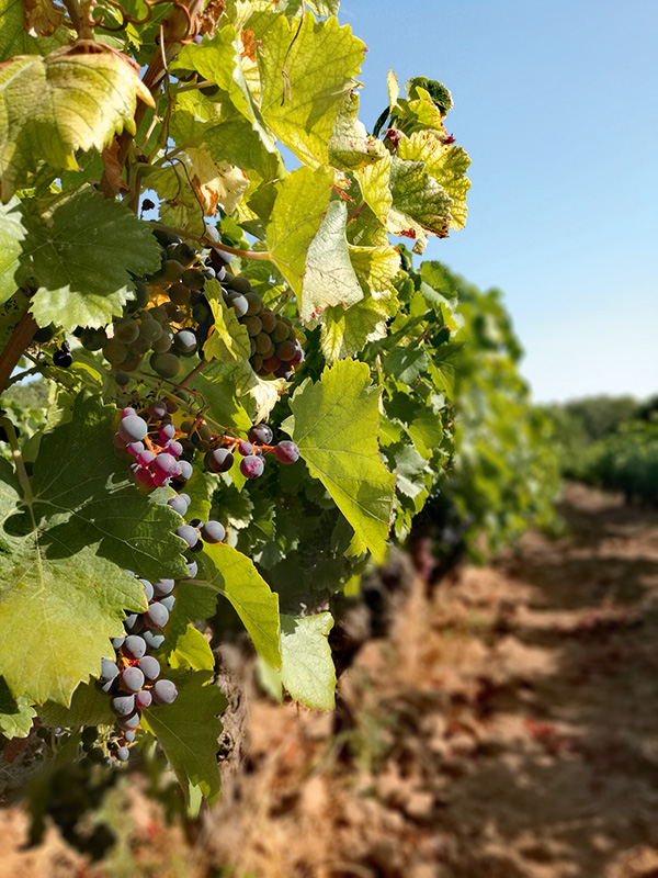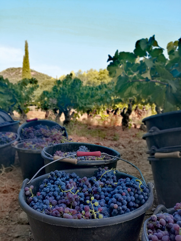 Les vendanges au château Fontainebleau sont essentiellement manuelles. Elles permettent de préserver au maximum l’intégrité des raisins et éviter ainsi tout phénomène d’oxydation et toute trituration susceptibles de nuire à l’expression du fruit, à la finesse du tanin et donc à la qualité intrinsèque du raisin que l’on va mettre en cuve. Le feu vert pour le ramassage est donné par l’œnologue après validation gustative des raisins. Des contrôles de maturité sont effectués régulièrement mais ils sont simplement un outil d’aide à la décision, ils ne peuvent en aucun cas, dans l’élaboration d’un vin de « cru », se substituer à la dégustation des raisins par l’œnologue, avec son expérience et sa connaissance des parcelles. Le terroir ne suffit pas, l’intervention de l’homme est indispensable, en l’occurrence il s’agit d’une femme. Avec sa sensibilité et ses vingt ans d’expérience dans le métier, c’est Valérie qui bat la mesure et les vendanges se déroulent sur plusieurs semaines. En effet, le décalage de maturité entre les cépages les plus précoces (chardonnay, syrah) et les plus tardifs (ugni blanc, carignan, mourvèdre, cabernet sauvignon) est important et tout doit être ramassé au bon moment, à la juste maturité.