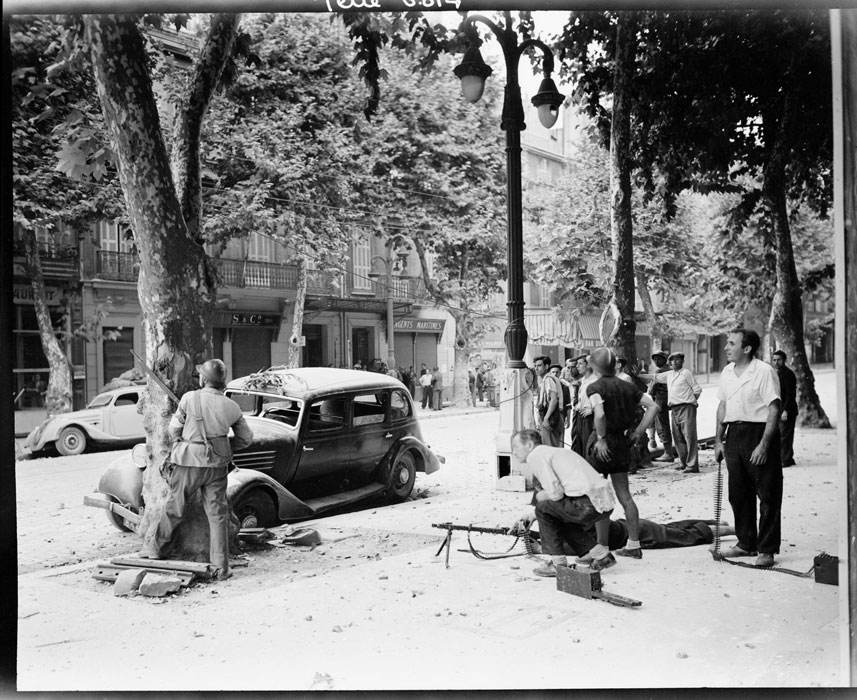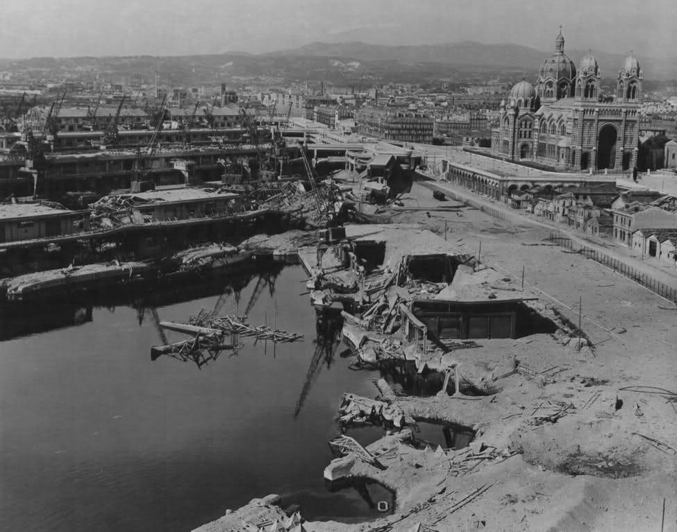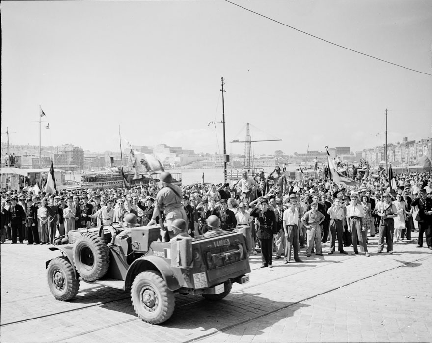 C’est de Cavalaire et des îles d’Hyères, où ils débarquent le 15 août, que vont venir les libérateurs de Marseille. C’est le début de l’opération « Dragoon » qui rassemble 400 000 soldats, dont 280 000 de l’Armée Française d’Afrique plaçée sous le commandement du général De Lattre De Tassigny. En quelques jours les principales villes varoises (Draguignan, Brignolles puis Toulon) sont reconquises par les alliés qui progressent vers Marseille par le nord et l’est. L’opération est confiée au général De Montsabert et à sa 3ème Division d’Infanterie Algérienne (parmi laquelle on trouve aussi des unités marocaines). Au total 5 000 hommes (auxquels s’ajoutent les FFI à l’intérieur de la ville) face aux 12 000 soldats de la 244ème division et aux 4 000 fusiliers marins de la Kriegsmarine. Tant par Cassis et la Gineste que par Aubagne et Allauch, la poussée française enfonce les positions allemandes, entraînant de nombreuses redditions. Le 23 août, les goumiers sont aux Cinq Avenues. La suite ne va être qu’une succession d’escarmouches et de combats de rue contre les postes de défense allemands. Les bombardements s’accroissent et les Marseillais – du moins ceux qui n’ont pas quitté leurs maisons pour aller se mettre à l’abri – assistent, muets d’effroi, à ce mortel feu d’artifice qui illumine le ciel d’été durant plusieurs nuits. Les Allemands, qui ont miné les installations portuaires, les font exploser méthodiquement entre le 21 et le 28 août, coulant 172 bateaux de commerce, entraînant aussi l’effondrement partiel du célèbre Pont Transbordeur (qui sera complètement détruit un an plus tard). Cependant, c’est la prise de Notre Dame de la Garde et des sites voisins d’Endoume et du Roucas Blanc qui va entrainer, dès le 24, les plus durs combats. Le 25, la garnison allemande de Notre Dame se rend. Les assauts se poursuivent, le 26, contre les bunkers du parc Borely et de Malmousque. Autre zone très fortifiée, les abords de la gare Saint-Charles seront l’enjeu d’affrontements sanglants jusqu’au bout. Après deux jours de pourparlers avec ses homologues français, le général Schaeffer signe, le lundi 28 août au matin, la capitulation sans condition des troupes allemandes. Au final, la bataille pour Marseille aura duré huit jours – quand les alliés en prévoyaient quarante. Elle aura fait, côté français, 1 500 morts et, côté allemand, 5 000 tués. La fête qui suivra, encore toute parfumée de poudre et de sang, sera à la mesure de l’évènement. Dès le lendemain, le peuple de Marseille se remet au travail. Car il faut reconstruire au plus vite les infrastructures ferroviaires et portuaires qui vont permettre, cette fois, l’acheminement des troupes et du matériel américains.