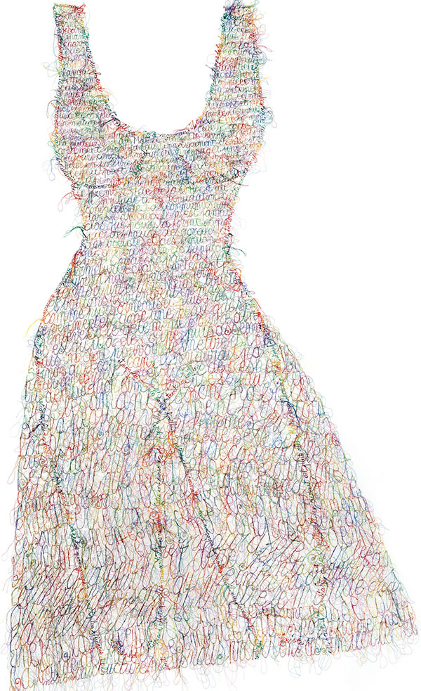 L’exposition dans son ensemble est à l’image de la robe de Fanny Viollet, enchevêtrement de fils colorés qui, lorsque l’on s’en approche, laisse apparaître une trame de mots, en une sorte d’anamorphose : une démarche raffinée, poétique et pleine de sens… pour qui veut bien prendre le temps de poser son regard… et de laisser le temps filer.