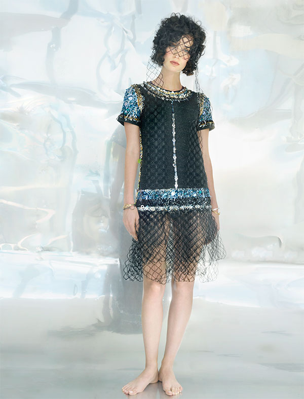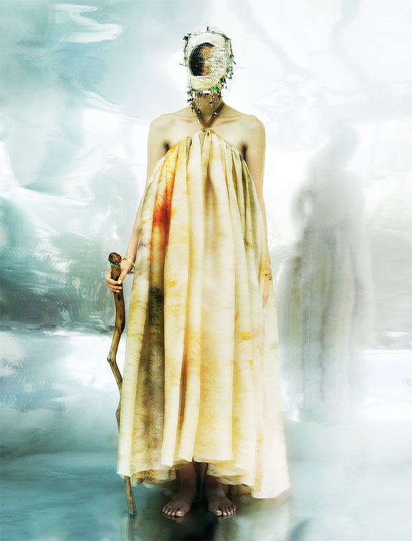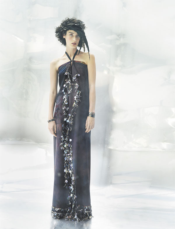 [dropcap text_color= » » background_color= »gray »]E[/dropcap]lle joue de la harpe sur le jersey de ses robes, aiguillée dans son geste par le volume de ses coupes et son doigté incomparable pour l’ornementation. La mélodie qui se dégage de ses vêtements, c’est à l’âge de 19 ans qu’elle a commencé à la faire résonner. Fred Sathal, née à Marseille en 1966, n’est pas passée par le cursus habituel de l’école de couture. Son dé elle le lance d’abord aux côtés de Geneviève Sevin-Doering, à l’atelier de l’architecture du costume. « J’observais beaucoup. À l’époque, c’était ça l’apprentissage, observer », raconte Fred, qui durant ces trois années prêtera l’oreille aux remarques, découvrira un panel de techniques et poussera sa réflexion artistique. « Pour pallier ce manque d’école, je décidai ensuite de me mettre en quarantaine et de faire mon école toute seule ! J’ai passé deux années à faire des recherches sur la peinture, sur les points d’ornementation, enfin, à produire une idée. »
