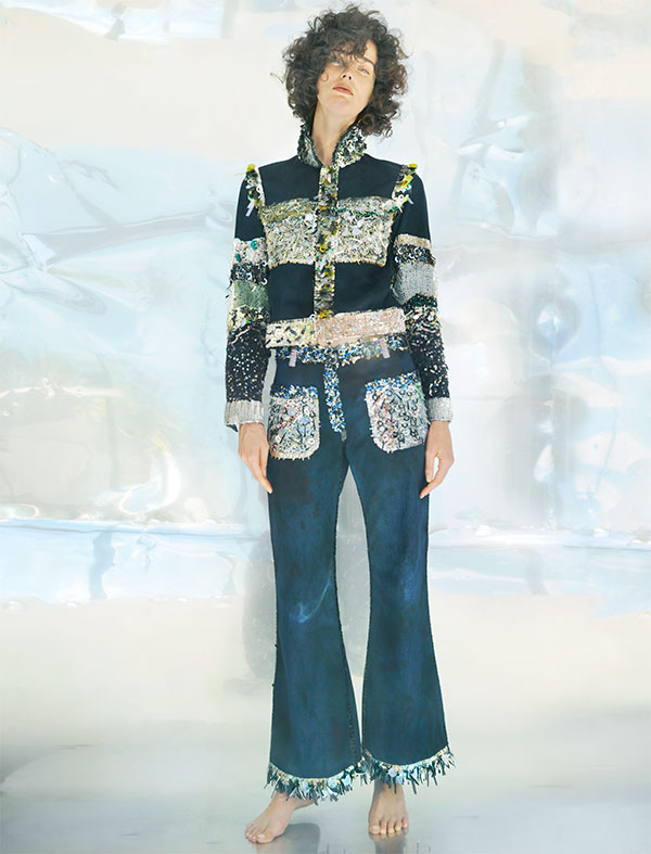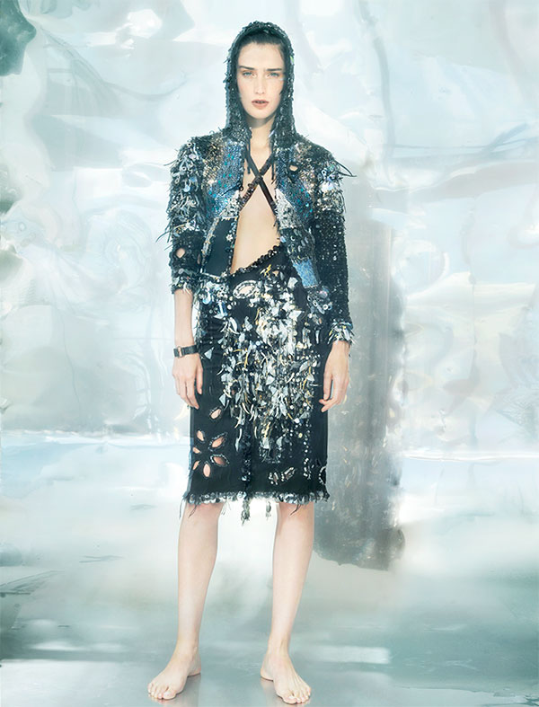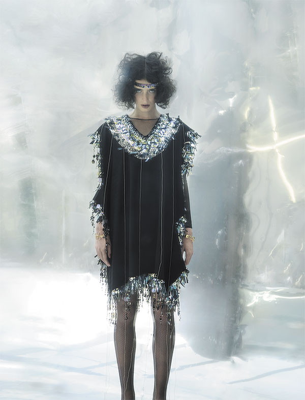 Elle a récemment lancé sa dernière collection 2017/2018, « Festin solaire ». Appétit des yeux dont les cils courbés font une ombre d’or, les vêtements s’étiolent en dentelles et pleurent des perles de lames. Un univers mystique et suraigu qui nous rappelle les talents polymorphes de la couturière attachée aux matières nobles, avec une attention particulière pour les détails. « Mes pièces sont uniques, elles ne sont que des prototypes », déclare Fred, d’une voix vibrante de sincérité. Il n’y avait que la couturière pour donner à palper le mot « imaginaire ».