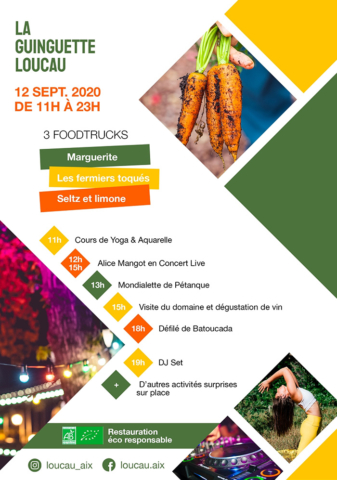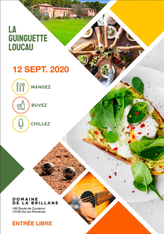 [dropcap text_color= » » background_color= »dark »]L[/dropcap]e beau domaine viticole de la Brillane à Aix-en-Provence, reçoit chez lui avec La guinguette Loucau, un food-court éphémère et gourmand ! Cet anglicisme soudain désigne une nouvelle tendance culinaire que Théo Ricard et Thibault Peres, deux jeunes entrepreneurs aixois, se sont ici appropriée. L’idée consiste à réunir dans un même lieu, des produits locaux en circuits courts évidemment ultra-frais afin de réaliser sur place une cuisine gourmande, créative et de terroir dans une ambiance conviviale. Cette idée somme toute très guinguette, se déroule samedi 12 septembre, entre 11h et 23h. Au programme, des foodtrucks, principe toujours amusant, assureront côté cuisine, et un grand espace bar fera déguster les vins bio du domaine de la Brillane, les bières artisanales de Saint-Cannat ainsi que des jus de fruits et légumes frais car l’alcool a ses limites. Mais encore ? Eh bien de la musique avec un live de la talentueuse Alice Mangot, un défilé de batoucada (musique traditionnelle des carnavals brésiliens) et un dj set à la nuit tombée. On nous promet même quelques activités surprises… De quoi passer encore une belle journée d’été insolite et festive en plein air.