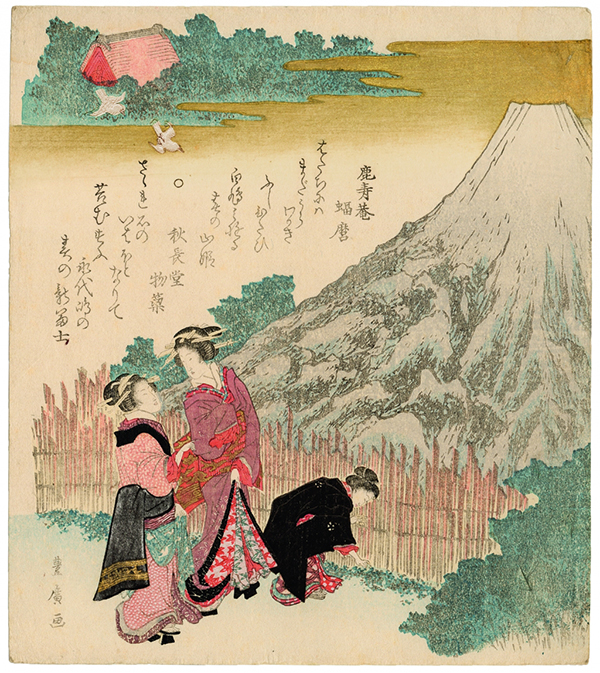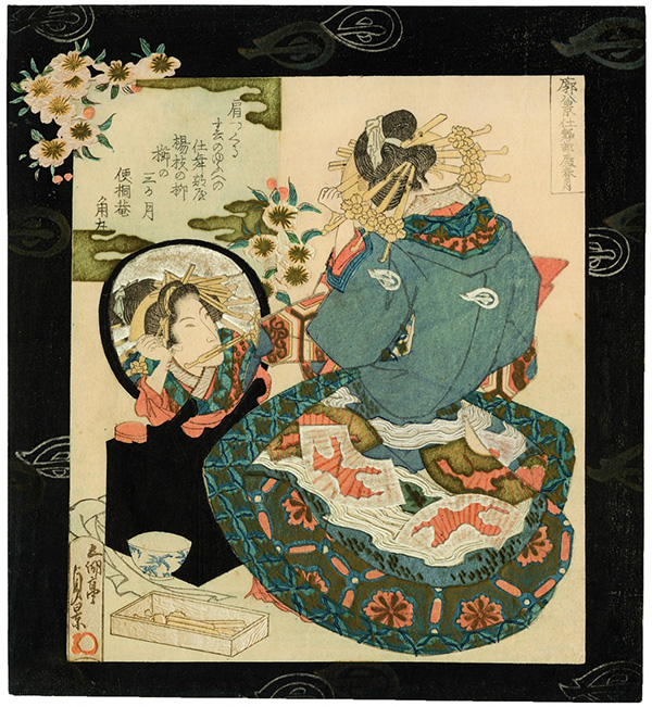 [dropcap text_color= » » background_color= »dark »]I[/dropcap]l enrichit au fil du temps sa collection d’estampes, notamment par l’acquisition de surimono, qui constituent le cœur de cette exposition. Ces estampes luxueuses qui associent compositions figuratives et poésie sont plus confidentielles. Elles étaient destinées à un usage privé : carte de vœux, fête familiale, célébration du Nouvel An… L’emploi pour leur réalisation de couleurs très riches et de matériaux luxueux, comme les pigments métalliques, modifia profondément l’art de l’estampe du Japon de l’ère Edo. Comme l’avait fait Harunobu dans la première moitié du xviiie siècle par le développement d’une technique permettant l’impression d’estampes multicolores à un coût moindre et dont on peut admirer certaines pièces au fil de l’exposition.