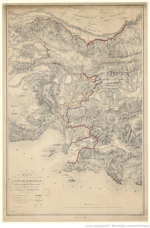 Enclavée entre mer et montagne, Marseille a jadis souffert de son manque d’accès à une eau potable, susceptible d’être consommée par ses habitants. Durant l’Antiquité et le Moyen Âge, le système d’acheminement de l’eau est des plus rudimentaires : construction de puits pour capter les nappes phréatiques, installation de citernes, construction d’aqueducs et de bassins d’eau douce pour capter l’eau pure des alentours… Ces solutions se révélèrent rapidement insuffisantes face à l’essor urbain de la ville : enclavée, densément peuplée, endurant un climat chaud et sec, Marseille ne dispose que de peu de ressources en eau douce. Ainsi, l’Huveaune, qui puise sa source dans le massif de l’Étoile et de la Sainte-Baume, et son affluent, le fameux Jarret (davantage connu comme un grand axe routier de Marseille que comme une rivière), ne suffisent plus à assurer l’approvisionnement en eau potable d’une ville qui se densifie et s’agrandit dès le xviie siècle. Si l’Huveaune permettait de fournir aux Marseillais 75 litres d’eau par personne et par jour en moyenne (la consommation moyenne actuelle est de 150 litres), tant sa qualité que sa pérennité faisaient défaut. Polluée, l’Huveaune a également souffert, en 1834, de la sécheresse qui réduisit la part d’eau potable consommable à la portion congrue d’un litre par personne et par jour, sans parler de l’épidémie de choléra qui s’ensuivit.