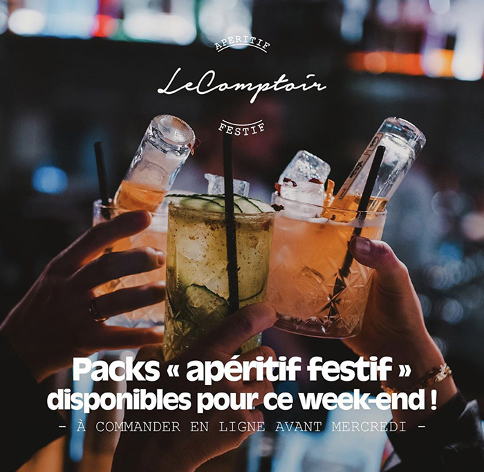 [dropcap text_color= » » background_color= »dark »]À [/dropcap]défaut de pouvoir se rendre au Comptoir d’Endoume, bar branché, ambiancé et sélect du 7e, c’est lui qui vient à nous ! Tous les jeudis, vendredis et samedis, il s’invite à la maison sous forme de packs repas gourmands et festifs… Au menu, une quantité de mets emblématiques du lieu, comme le fameux croque truffé (à faire réchauffer chez soi pour qu’il soit bien croustillant), le houmous traditionnel et son pain pita, ou encore les polpettes sauce au pistou. Il y a même une baguette de pain. Et devinez qui se cache en cuisine ? Le duo Ludovic Turac et Gianni Costagli du Petit Plat (8e), pardi ! Si on ferme les yeux, notre apéro déconfiné (mais à la maison) prendra bien vite des airs de rue d’Endoume au crépuscule : le parfum du Comptoir embaume l’air, une ambiance festive se crée petit à petit… En se délectant d’un vin de caractère, d’un champagne Deutz ou d’un Moscow Mule (kit de cocktails à faire à la maison), selon ce qu’on aura choisi dans la formule, on écoute la playlist évolutive du Comptoir et on s’évade… La seule question qui reste en suspens, c’est de savoir avec qui vous voulez partager ce moment.