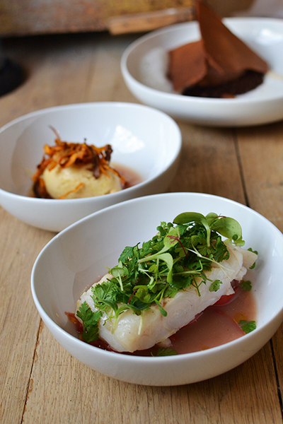 [dropcap text_color= » » background_color= »dark »]F[/dropcap]ranchissez la Sorgue par le premier petit pont de la rue des Teinturiers et vous voici hors du temps, dans la cour du Lieu. Le clocher du couvent des Cordeliers veille en surplomb sur cette maison bourgeoise xixe que l’on croirait privée. Le charme continue d’opérer lorsque vous poussez la haute porte de laque noire. Carole, propriétaire raffinée et esprit du Lieu, a imaginé une bibliothèque « cosy » et une salle à manger épurée où l’accueil chaleureux de l’équipe de Sarah, maîtresse d’hôtel et sommelière, vous enveloppe. Aux fourneaux, son époux Julien propose une jolie cuisine d’auteur. La polenta crémeuse qui accompagne le lieu jaune au bouillon de sapin arrive à point nommé pour vous réchauffer au cœur de l’hiver et les pointes d’audace du dessert chocolat et cèpes achèveront de vous séduire. Notez aussi que le jardin, isolé de la rue par la bâtisse, est une promesse de calme pour les beaux jours animés !
