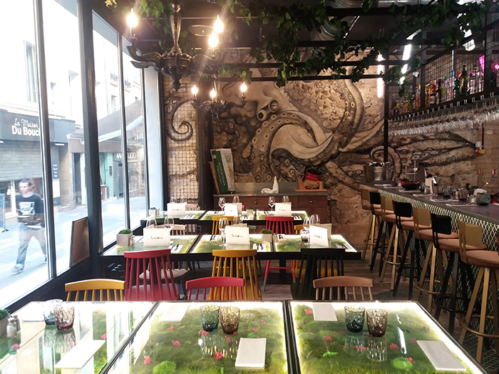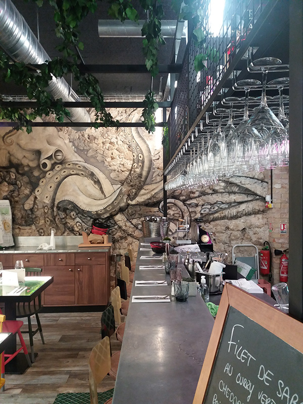 [dropcap text_color= » » background_color= »dark »]L[/dropcap]a rue des Cordeliers est en pleine effervescence… Restaurants, commerces de bouches et boutiques de décoration remplacent peu à peu les enseignes de vêtements vieillissantes ! C’est dans cette dynamique que deux couples d’amis ont monté Le Quatre. L’espace est généreux et la verrière de la devanture largement ouverte sur la rue. Ici, on déjeune et dîne sans façon, faisant honneur à des plats selon l’inspiration du chef ou à des planches à partager. On aime les œufs bio du coin et les panisses maison, bien d’ici, mais on ne boude pas la salade thaïe au quinoa, au gingembre et à la menthe qui accompagne l’avocado toast. Mention spéciale pour le poulpe de la maison. Celui-là n’est pas dans l’assiette (en ce moment) mais ses tentacules se déroulent poétiquement sur les murs de la salle : une création du collectif de graffeurs professionnels YakaOneSkeum.