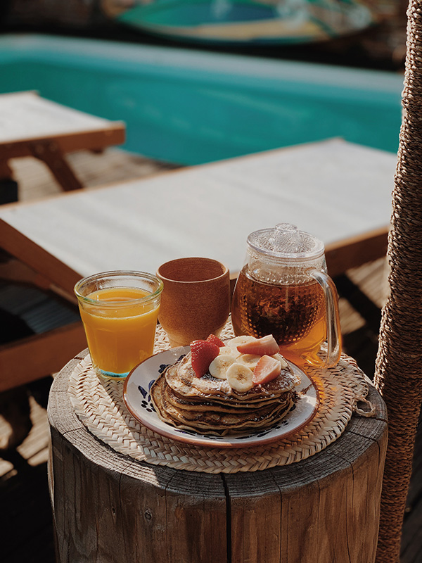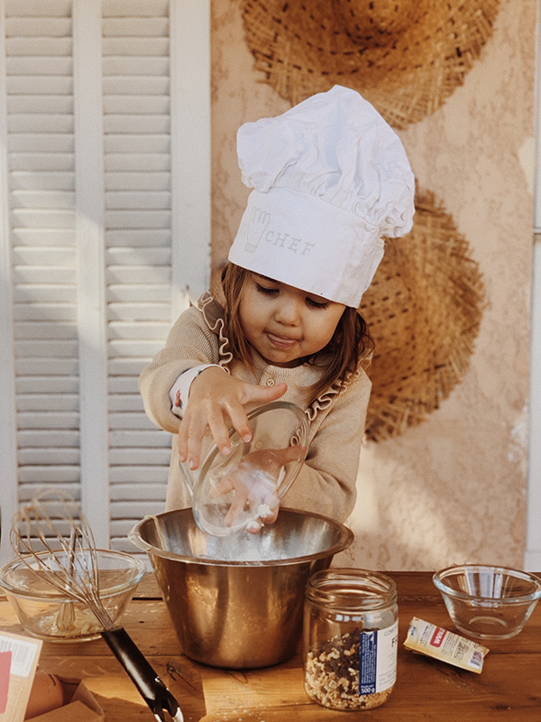 En fin de matinée, soit nous jouons les pâtissières toutes les deux, soit elle fait du bricolage, du jardinage, etc. avec Tom, quand ils ne nettoient pas la piscine… L’idée, c’est qu’elle se dépense de façon ludique avant le déjeuner.