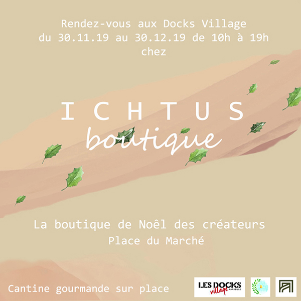 – Ichtus, le pop-up store 100 % phocéen, imaginé par les influenceurs Nicolas Lopez (un Méditerranéen) et Angélique Gionti (jamaissansdarling). Dans une ambiance bohème et méditerranéenne, habillée par Alinéa et Plantes pour tous, on retrouve une vingtaine de créateurs locaux qui touchent aussi bien au monde de la gastronomie qu’à celui de la mode. Parmi eux, Marseille en vacances, les Microbiotes, le Petit Savon, Koto&Kala, Une Canopée… Pensé comme un lieu de vie et d’échanges, le pop-up store nous permet de consommer sur place les plats de kféK traiteur (en semaine) et les boissons chaudes de Chez Gaston (le week-end). Mais ce n’est pas tout, il y a également des ateliers prévus pour petits et grands…
