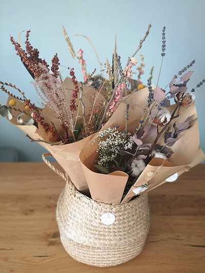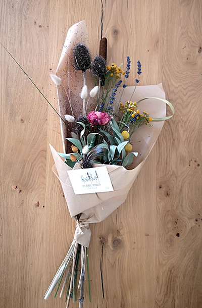 [dropcap text_color= » » background_color= »dark »]É[/dropcap]milie Delorme a grandi dans la Loire. De sa campagne natale, elle a gardé le goût des balades dont on ramène branchages, souches, bois blanc, écorces, plumes et herbes folles pour composer des décors naturels et éphémères. Formée à l’art floral chez un Meilleur Ouvrier de France, Émilie démontre son talent dans des créations uniques, livrées chez vous ou sur votre lieu de travail. À mille lieues des standards, avant d’élaborer un bouquet, une couronne ou un bijou floral, elle sait cerner vos habitudes et vos envies. Aujourd’hui installée dans le Sud, elle rapporte de ses promenades au grand air chardons, roseaux, herbes de la pampa et autres graminées qu’elle marie avec des fleurs fraîches ou séchées et stabilisées… Généreuse, Émilie transmet un peu de son imagination et de son savoir-faire à l’occasion d’ateliers qu’elle anime sur réservation pour de petits groupes : avis aux demoiselles d’honneur qui préparent un EVJF !