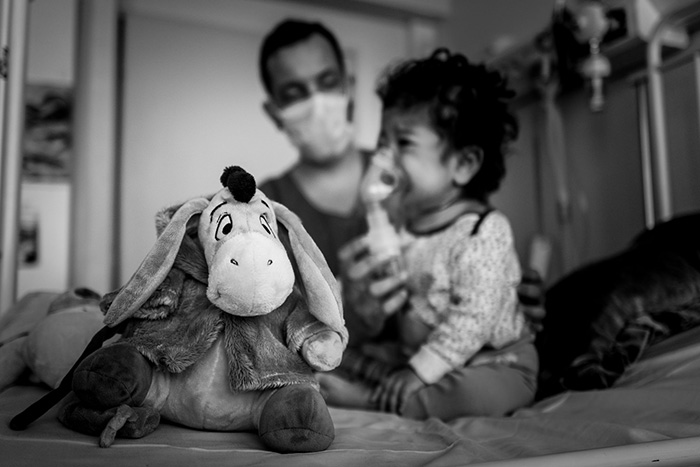 D’un débit rapide et enthousiaste, Sophie raconte son expérience de portraitiste qui endosse la cape de photoreporter, mais elle s’efface vite pour laisser la place à ses modèles qui racontent la vie d’un service hospitalier particulier, celui de pédiatrie multidisciplinaire à la Timone. Petits patients, parents, soignants… ce service est une bulle d’un genre unique : « Je suis arrivée à la Timone parce que je voulais offrir un portait de famille aux enfants hospitalisés et à leurs parents. J’avais cette envie, cette intuition. Et pour m’intégrer au service j’ai fait du photoreportage. Je savais que les soignants et tout le personnel hospitalier faisaient un travail extraordinaire. Mais le voir à travers mon objectif a donné une direction nouvelle au projet et le reportage a pris autant de sens que celui, initial, des portraits de familles. Les soignants font un job incroyable et offrent un relais affectif important aux enfants atteints de maladies au long cours et dont les parents ne peuvent rester en permanence à l’hôpital. »
