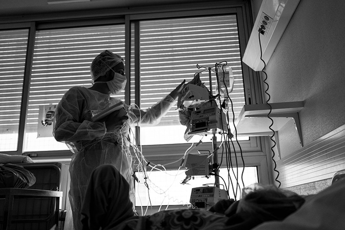 « Chaque jour, ce service connaît des victoires. Des douleurs aussi et là, la tristesse est considérable, mais les personnels hospitaliers continuent à se dévouer. J’ai passé cinq journées intenses dans ce service », continue la photographe. La pandémie que nous traversons aujourd’hui est l’occasion pour elle de se replonger dans ce travail. « Aujourd’hui, souligne-t-elle, je suis à nouveau bouleversée par les retours des soignants qui donnent chaque jour de leur personne. Ils côtoient la perte, la souffrance mais aussi le bonheur. Leur quotidien est dur chaque jour, pas uniquement pendant l’épidémie de Covid, mais dans le service il n’y a pas que la mort ou la maladie. Oui, il y a des temps de soin, mais il y a aussi des regards, des rires, de l’amour tout simplement. Ces gens ont un boulot difficile. Leur force n’est pas dans le fait de supporter le pire, mais dans tout ce qu’ils donnent au quotidien. » Ces photos leur ont permis de reconnecter avec ce qu’ils font et qui ne se résume pas à sauver des vies. Et puis c’est une véritable équipe qui se tient derrière eux, du chef de service à l’homme d’entretien, tous captés par l’objectif de la photographe, qui tient entend bien « continuer à développer ce projet, car lorsque l’on n’est pas confronté aux soins on ne saisit pas vraiment ce qui se joue à l’hôpital ».