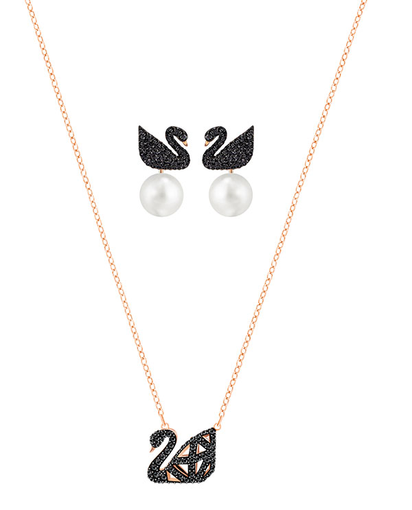 SWAROVSKI – Iconic Swan, Métal doré rose, cristaux noirs & perles de cristal