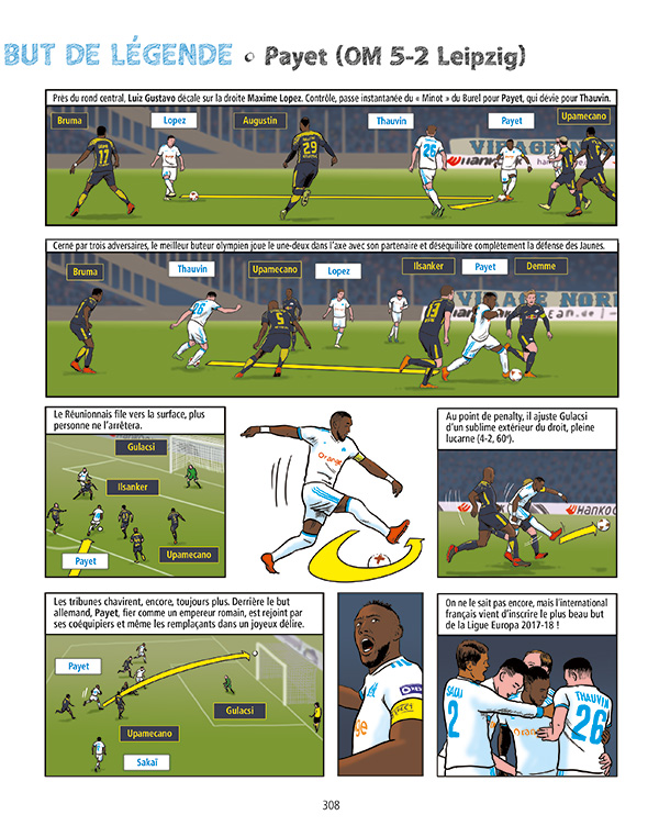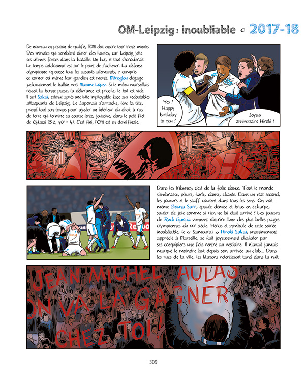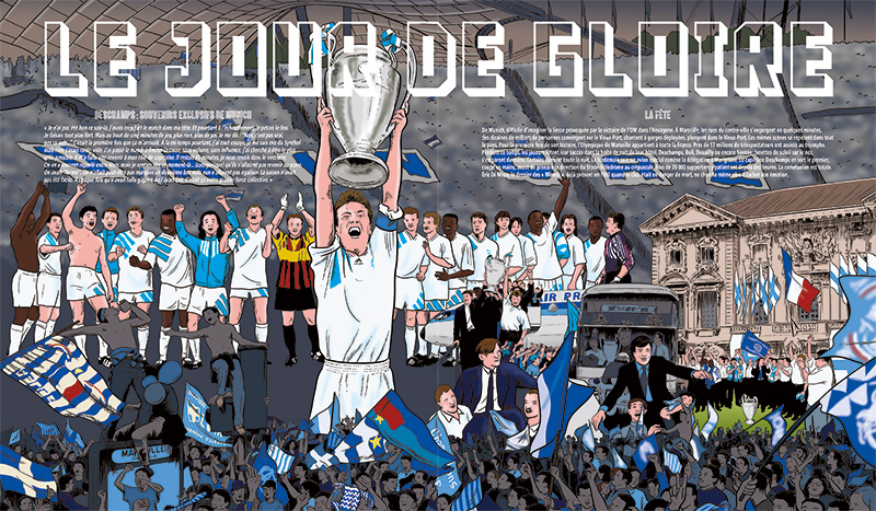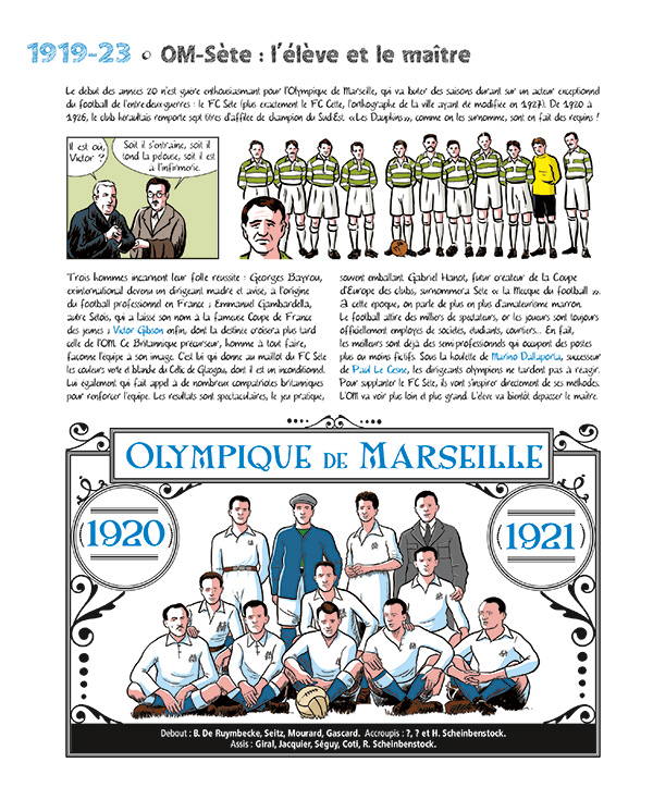 [dropcap text_color= » » background_color= »dark »]A[/dropcap]llons droit au but : quand on vous parle d’une bande dessinée de plus de 300 pages qui serait un panorama complet de l’histoire de l’OM, avec interviews, fiches techniques, descriptions de buts, coupures de presse, etc., vous vous dites que c’est bien gentil, généreux comme un match phocéen, mais que d’une, ça va avoir du mal à tenir debout cette affaire et de deux, on vous fait le coup de la sardine qui bouche le port de Marseille. Pourtant, par la magie du dessin qui impose l’air de rien sa cohérence, ça fonctionne parfaitement. Des interminables voyages en train dans les années 1920 aux histoires de filets troués, en passant par les frasques de Pepito Alcazar ou encore, évidemment, la victoire en Ligue des champions : une épopée passionnante !