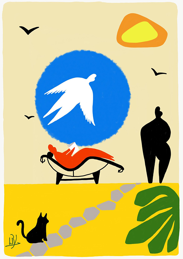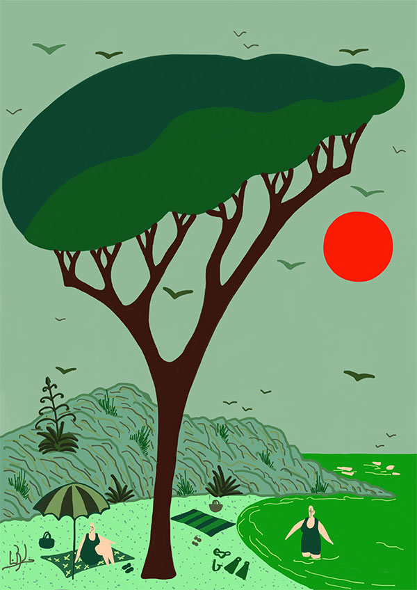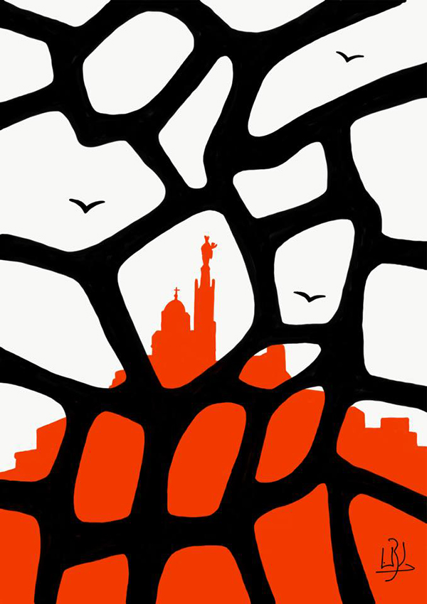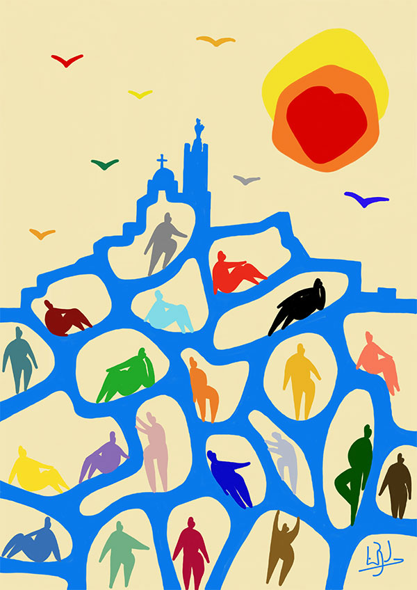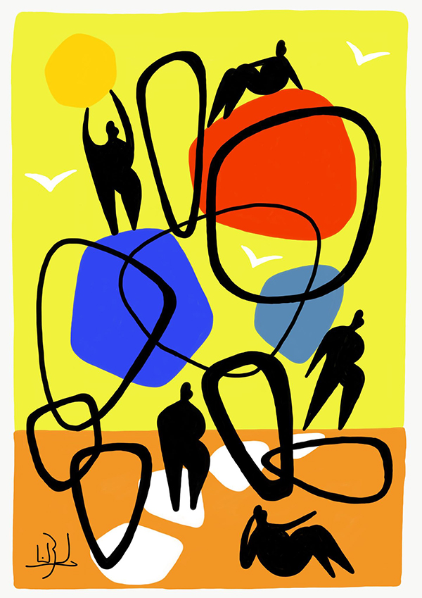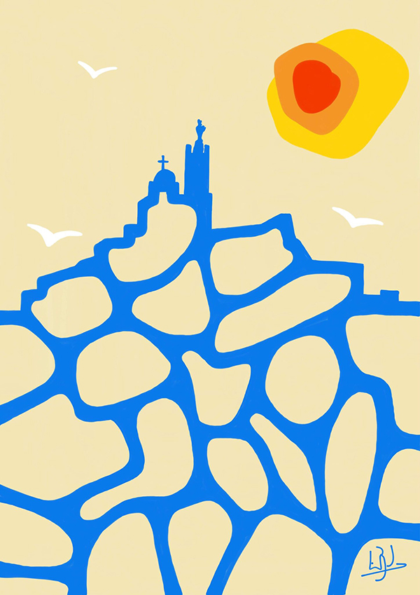 Rigueur et rythme vont constituer les fondements de son vocabulaire graphique, qu’il développe chaque jour, inlassablement, naviguant entre réalité et imaginaire, synthétisant le formel pour l’interpréter graphiquement. En parallèle, il se passionne pour l’esthétique des années 1950, Le Corbusier, Matisse, Miró mais aussi les recherches picturales de la fin du XIXe, avec Vallotton, Denis, Derain, etc. Ces influences se ressentent dans ses compositions bidimensionnelles. Il peuple ses espaces-plans de silhouettes épurées, de signes graphiques, d’aplats de couleurs, de pleins et de vides. Ses thèmes sont ceux du Sud, où il a toujours vécu (de Menton à Marseille) et auquel il rend hommage : scènes de plage, baigneuses, pinèdes, cabanons, architectures… Toutes les formes stylisées virevoltent, telles des notes de musique dans monde silencieux, baigné de joie par la couleur et les tonalités lumineuses.