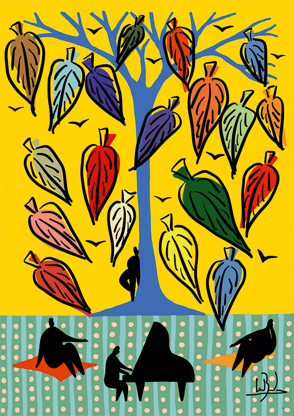 [dropcap text_color= » » background_color= »dark »]L[/dropcap]’artiste a cheminé un temps avant que la peinture ne lui apparaisse comme une évidence, le territoire d’expression idéal pour donner libre cours à son imagination. La révélation, il l’eut précisément devant Les Musiciens de Braque, à la Fondation Maeght. Depuis, vingt et un ans ont passé et son plaisir reste intact. Chaque jour, le même sentiment de « plénitude et d’absolu » devant l’espace du papier encore vierge de ses traits et couleurs.