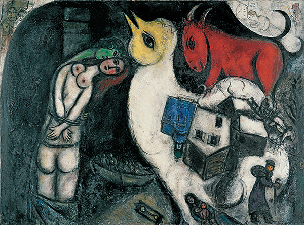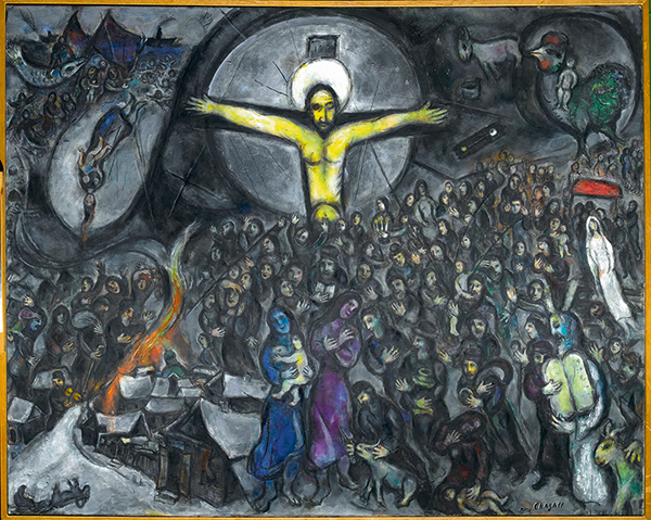 Marc Chagall, au style évolutif et inclassable, connu pour être un maître incontesté de la couleur, des formes et de la technique, conserve, paradoxalement, une zone d’ombre, largement liée à ses origines hébraïques et au funeste destin du peuple juif pendant la guerre. Obsédé par la Bible, hanté par l’image de la crucifixion, il semble établir entre la souffrance de Jésus sur la Croix et celle des Juifs un parallèle incessant (L’Exode, 1952-1966). Une utilisation prononcée de la couleur noire dans son œuvre témoigne, alors, de l’exil intérieur et de la souffrance que l’on ne peut dire autrement que par l’art.
