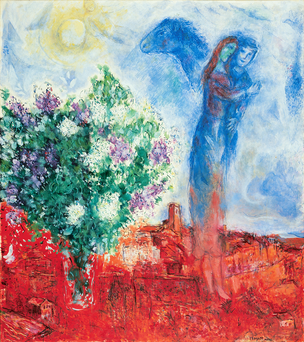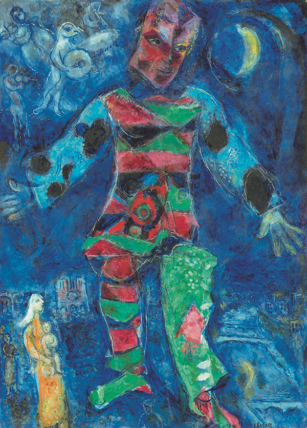 témoignent d’un renouveau de son art au contact des potiers, céramistes, émailleurs, costumiers et des lumières de l’Azur. Il témoigne aussi d’une vague d’optimisme intérieur (L’Arlequin et Le Village fantastique), toujours liée aux origines du peintre, avec la création, en 1947-1948, de l’État d’Israël. À cette époque, l’œuvre de Chagall prend aussi du relief : céramiques, sculptures…