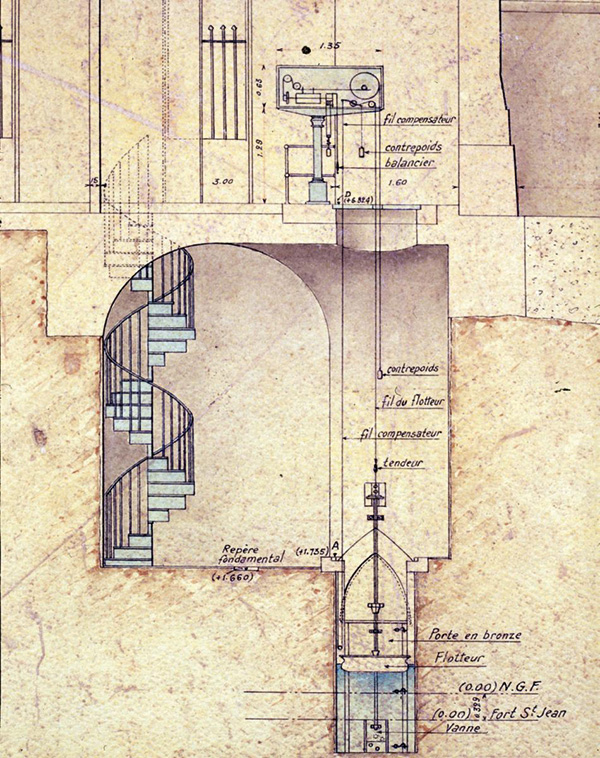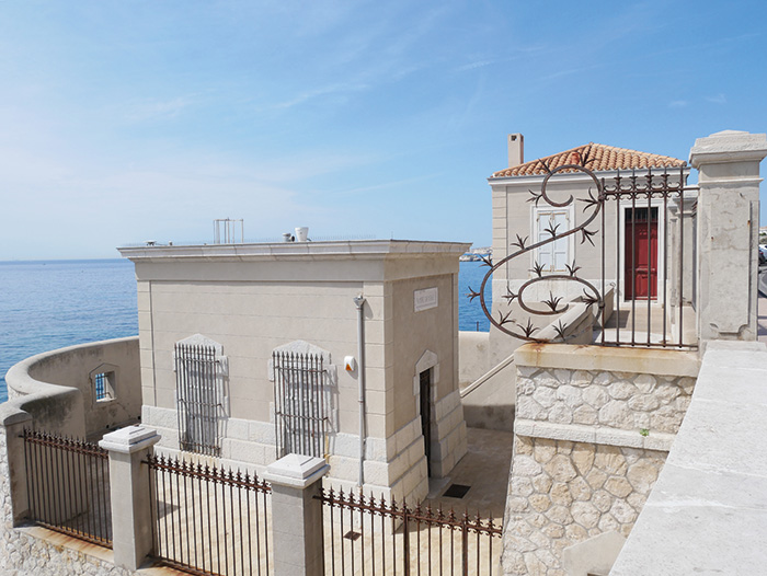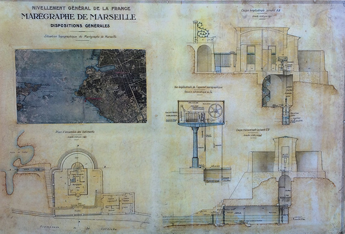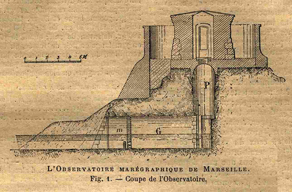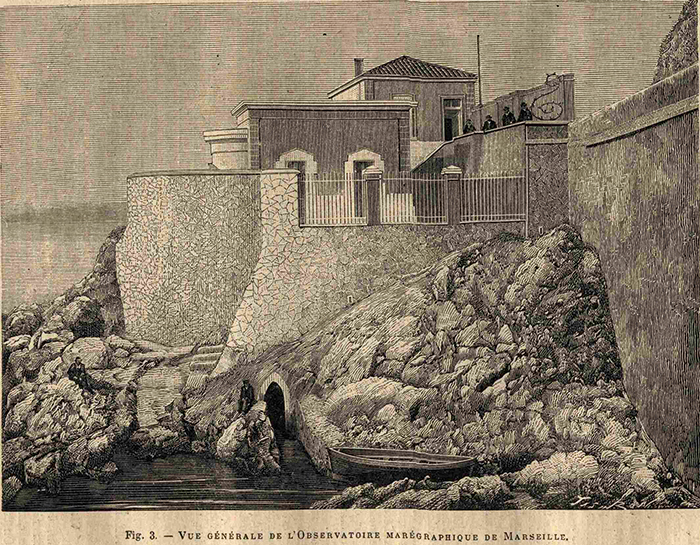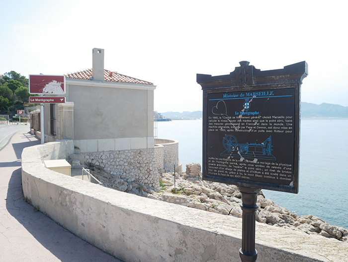 [dropcap text_color= » » background_color= »dark »]Q[/dropcap]ui, en se promenant sur la Corniche Kennedy, n’a jamais aperçu, en contrebas, aux alentours du numéro 174, un bâtiment singulier qui jouxte les eaux au point de se confondre avec les rochers ? Ce bâtiment, plus connu sous le nom de marégraphe de Marseille, a en effet beaucoup à voir avec l’océanologie puisque, fait peu connu, il constitue le point zéro de l’altitude en France métropolitaine. C’est à partir de lui que se mesure l’altitude de tous nos reliefs ! Pour être tout à fait exact, un premier marégraphe fut établi à Marseille, entre 1849 et 1851, par l’ingénieur hydrographe Antoine Chazallon, dans le port de la Joliette. Mais en 1884, la Commission du nivellement général de la France fit construire le long de la Corniche un observatoire permanent connu sous l’appellation « Marégraphe de Marseille ». Si ses activités débutèrent vraiment en 1885, il fallut attendre près de douze ans pour que le point zéro de l’altitude soit fixé, après de longues observations des variations du niveau de la mer.