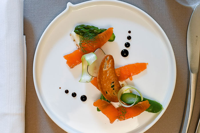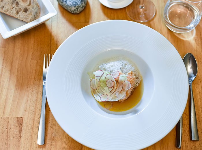 [dropcap text_color= » » background_color= »gray »]P[/dropcap]our sa deuxième adresse, l’étoilé Mickaël Féval met le couvert côté mer. Cet ancien de chez Antoine (à Paris) aime se ressourcer au large de la dune blanche de Molène, petit caillou secret comparé à Trébeurden, dans les Côtes-d’Armor. Un îlot où Olivia, sa femme, apprit enfant à pêcher la crevette, où il la demanda en mariage et où il puise son inspiration pour sa carte « retour de pêche ». Le chef a confié la barre de ce deuxième navire à Julien Courtin, son second depuis près de dix ans. Si l’air marin souffle sur toute la carte, la terre n’est pas en reste avec des accompagnements inspirés par le marché local : l’églefin fumé, accompagné d’asperges vertes de Venelles, relevé d’une crème au raifort et sarrasin torréfié, invite les papilles à prendre le large. Le repas est un voyage où l’on s’étonne à chaque plat des touches audacieuses et délicates qui illuminent la pièce maîtresse.