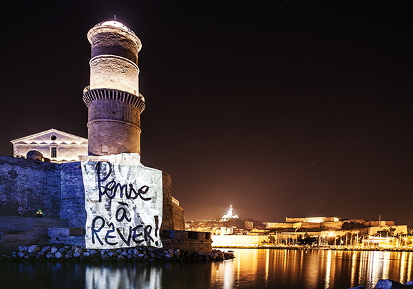 PE : J’ai lancé cette forme d’art urbain que la presse a nommée « street art 2.0 » en 2014, en faisant réapparaître (projection lumineuse via un rétroprojecteur) le portrait de notre Zizou national sur son mur de la Corniche Kennedy. Ce lancement a été vu dans plus de 57 pays, je n’en reviens toujours pas. J’ai fait énormément d’expérimentations dans différents lieux de la ville. En 2016, j’ai eu la chance de pouvoir faire une exposition d’une semaine avec le Vieux-Port tout entier comme galerie, c’était un vrai rêve !