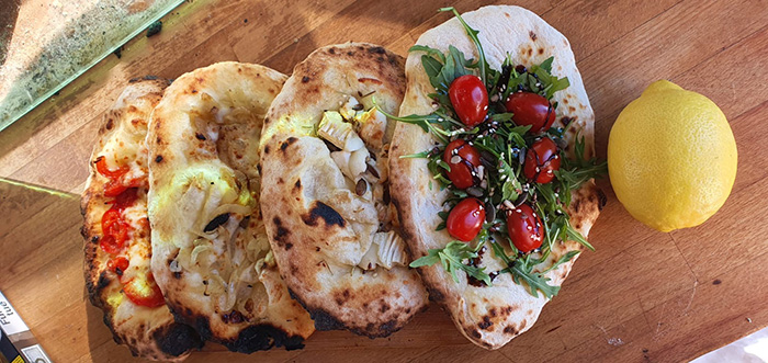 [dropcap text_color= » » background_color= »dark »]L[/dropcap]’adresse reste bien gardée et le camion stationné au Prado relativement discret, mais le bouche à oreilles n’a pas tardé à faire connaître ce foodtruck ouvert il y a quelques mois. Certains joueurs de l’OM, comme Florian Thauvin, sont déjà des habitués du lieu. Il faut dire qu’il est difficile d’oublier l’accueil chaleureux de Déborah et Golan, de même que les saveurs qui se diffusent depuis le four à bois. Bien entendu, les pizzas sont à l’honneur, fines, généreusement garnies et variées, mais le matin, le four sert aussi à préparer tous les bons plats que confectionne Déborah pendant que son mari s’affaire à pétrir la pâte : souris d’agneau cuite à l’étouffée, gratin dauphinois, camembert rôti aux herbes, tomates farcies… Tout est préparé maison et cuit au feu de bois. Clafoutis, compotée mangue-passion montée à la crème, tiramisu caramel beurre salé et autres douceurs viennent compléter une offre journalière toujours inspirée. Déborah et Golan font aussi leurs propres pains comme la pita ou la challah servis en Israël. Et comme le camion ne suffit pas, ils prévoient d’investir au printemps la campagne Pastré pour y préparer des repas et amener leurs hôtes en tripoteur réaménagé, le temps d’un déjeuner en plein air.