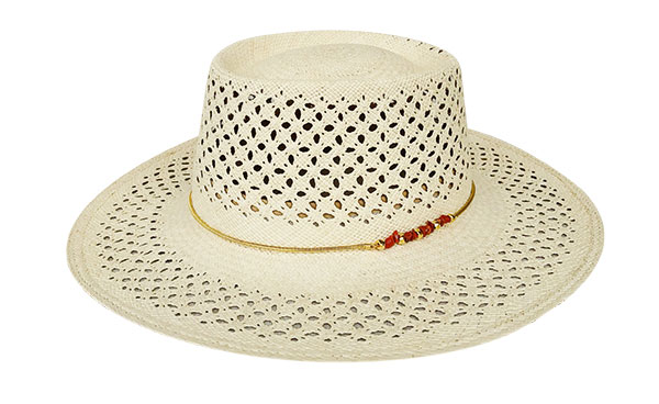 Chapeau en paille Tallulah avec bijoux en or et coraux, 230 € www.vanpalma.com