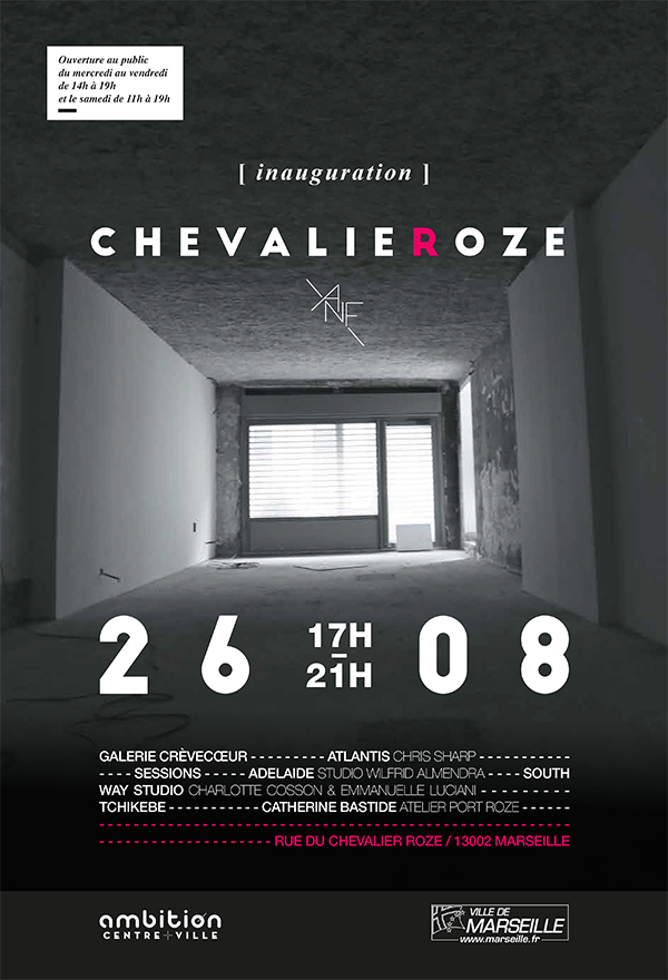 [dropcap text_color= » » background_color= »dark »]S[/dropcap]ous ce nom familier de Chevalier Roze se cache une rue et un projet de pôle artistique très important, totalement financé par ANF immobilier, responsable du développement de la Rue de la République. Plus de 800 m2 en cours de rénovation depuis bien des mois seront prêts à accueillir un énorme fonds d’art contemporain pour le plus grand bonheur des amateurs et ce dès le 26 août prochain. Cette magnifique initiative est évidemment associée à des galeries notoires qui viennent s’installer dans notre belle cité, notamment la galerie parisienne Crèvecœur avec une exposition de cinq artistes internationaux, et celle de Catherine Bastide qui soutient le développement de l’art et l’artisanat dans les pays du sud et promet une programmation internationale. Dans ces 800 m2 résideront aussi Lumière, un groupe de collectionneurs marseillais créant l’espace Atlantis ; SESSIONS, un espace d’expo dédié à l’image-mouvement ; Tchikebe une boutique d’éditeurs d’art indépendants ; un atelier d’artiste – celui de Wilfrid Almendra – qui ouvrira son espace à la collaboration, la production et la diffusion de nombreux artistes et pour finir, le studio South Way de Charlotte Cosson & Emmanuelle Luciani, figures intellectuelles, éditrices du magazine CODES South Way et duo emblématique de l’art à Marseille.
