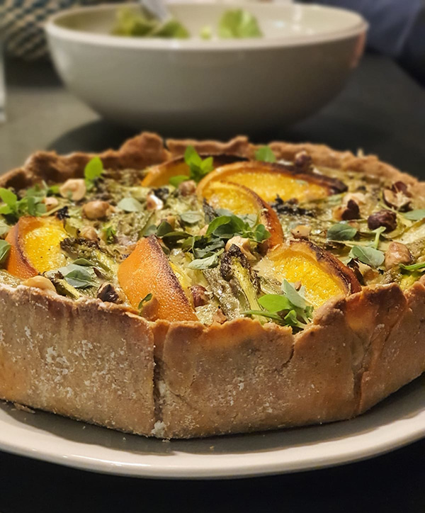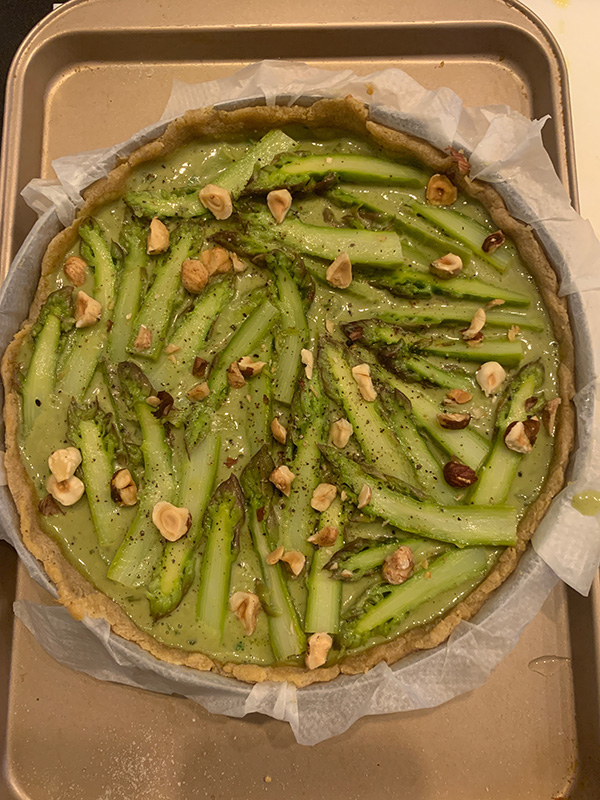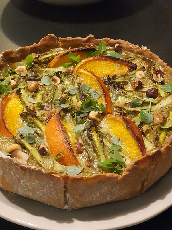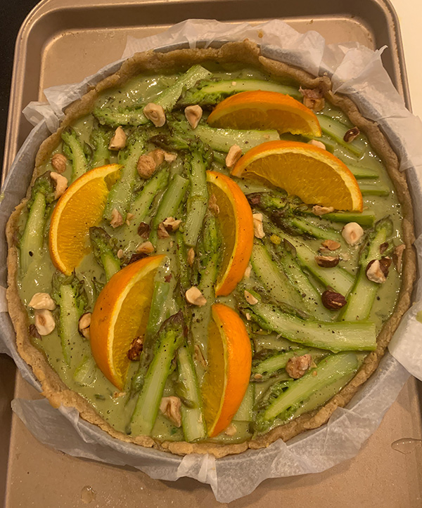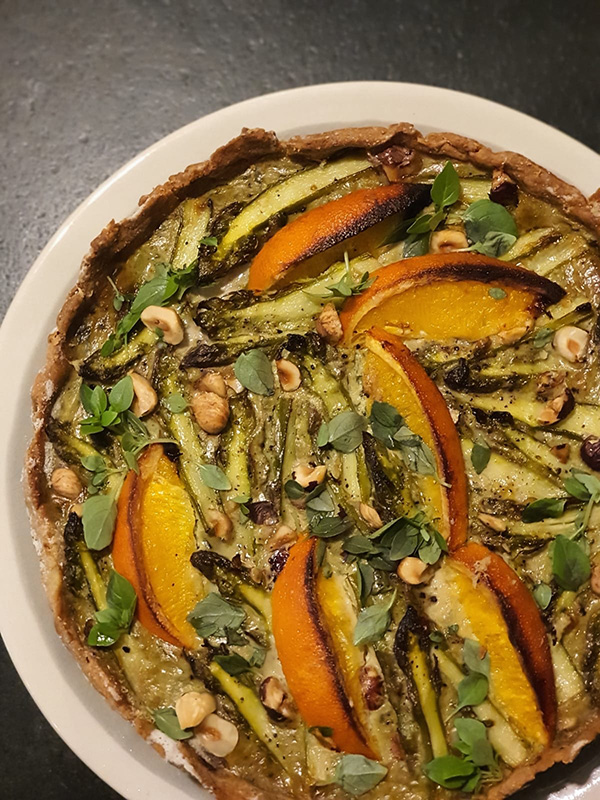 [dropcap text_color= » » background_color= »dark »]L[/dropcap]a saison des asperges vertes bat son plein, et je ne sais pas vous, mais nous, on en raffole ! Alors comment les sublimer ? Créative, la cheffe marseillaise Charlotte Crousillat (restaurant Carlotta With, 6e) nous dévoile sa recette de la tarte sablée aux asperges, pesto, noisettes et oranges. Prêt à mettre le tablier ?