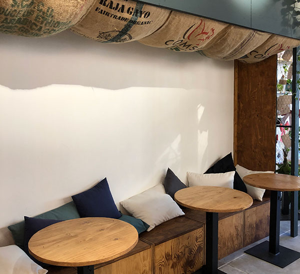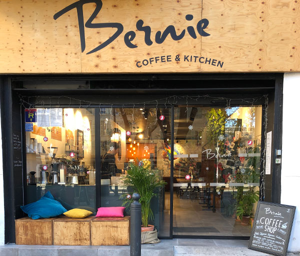 [dropcap text_color= » » background_color= »dark »]O[/dropcap]uvert en septembre 2018, sur la place de Rome, à deux pas de la préfecture, Bernie Coffee propose son propre assemblable de cafés bio et équitables, torréfiés chez André Luciani. Dans une ambiance d’échanges et de partage, Nadia et Julien (anciennement chez Colombus Café) véhiculent ici des valeurs sociales et environnementales, mettant par exemple le lieu gratuitement à la disposition d’associations. Partenaire de l’association Le Carillon, Bernie permet aux sans-abris d’accéder à ses commodités, mais également de passer un coup de fil d’urgence. Par ailleurs membre de l’application To Good To Go, Bernie lutte à son échelle contre le gaspillage alimentaire. On retrouve aussi entre ses quatre murs une bibliothèque participative et un atelier créatif pour enfant. Le midi, des plats de saisons à un prix abordable (collaboration avec la plateforme paysanne PPL), majoritairement végétariens et bio, nous font de l’œil… Dans une ambiance chaleureuse, les étiquettes tombent autour d’un bon café bio accompagné d’un brownie sans gluten garni de haricots rouges…