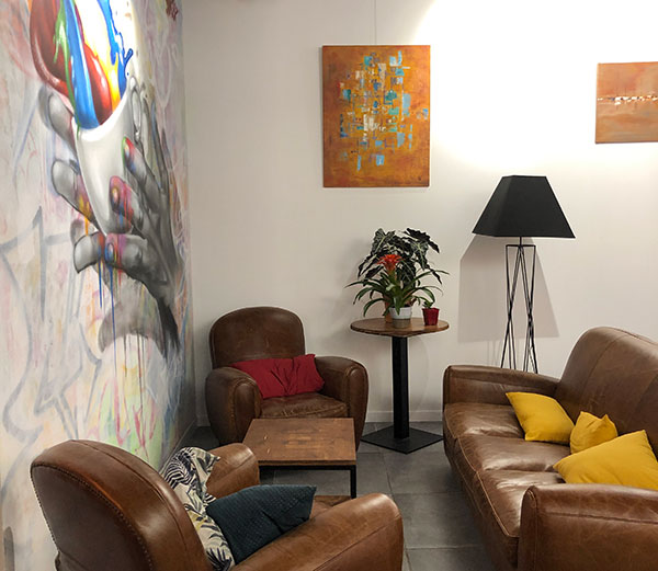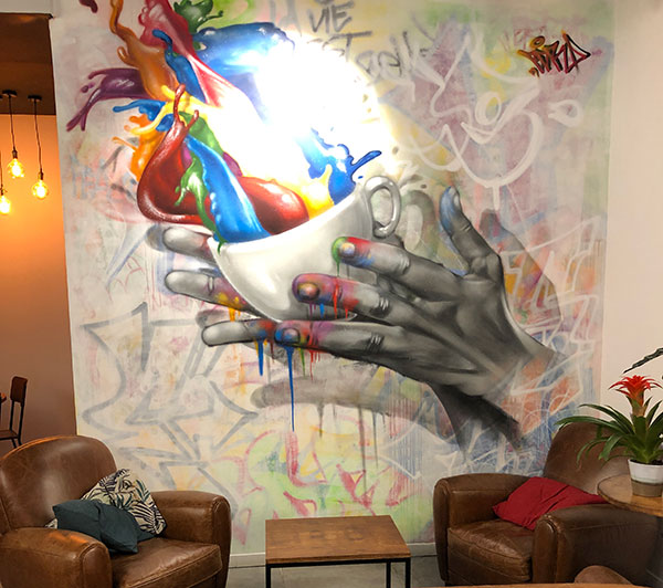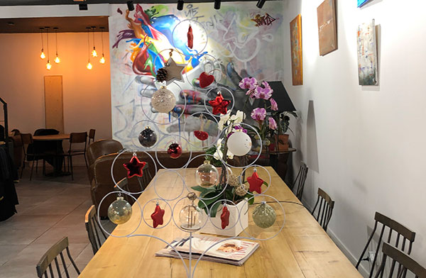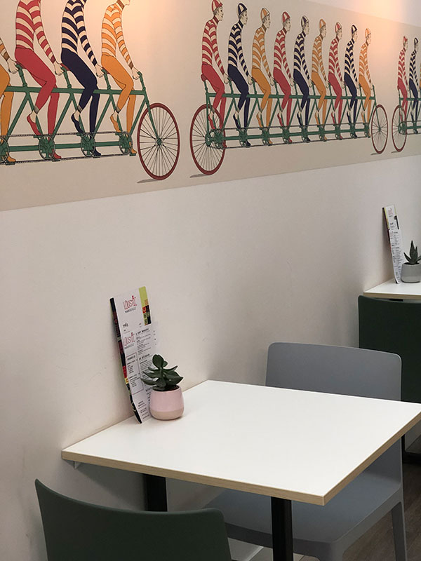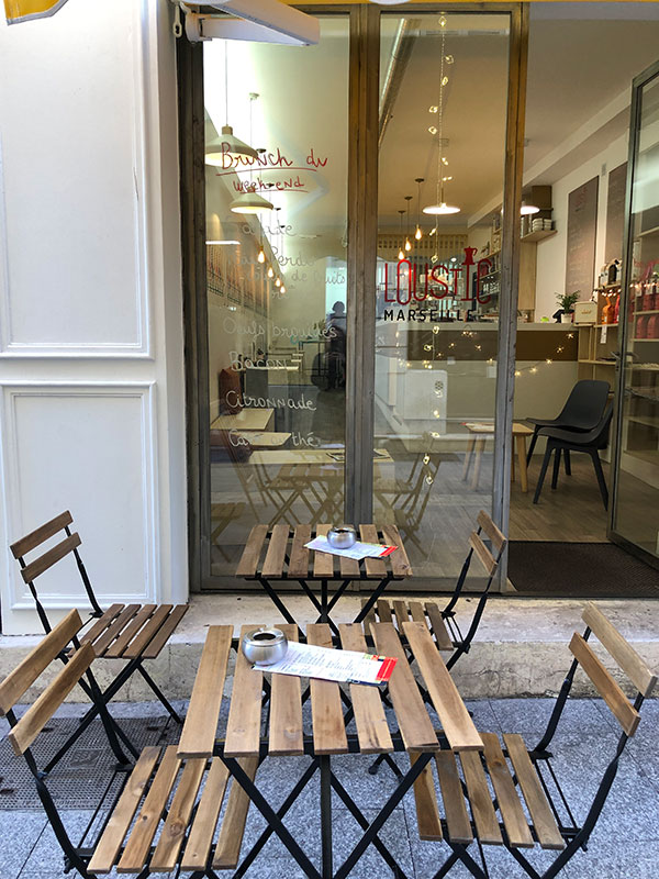 [dropcap text_color= » » background_color= »dark »]O[/dropcap]uvert en juillet 2018, en plein du centre-ville marseillais, Loustic s’engage à proposer un café de qualité associé à une cuisine exclusivement maison et de saison. Dans un espace de 70 m2 épurés et décorés d’une banderole de papier peint colorée, qui met à l’honneur des cyclistes (La Ressource), on observe la réalisation des mets, sous nos yeux, en cuisine : gage de confiance et de qualité. On se laisse tenter par une brioche à la cannelle qui sort tout juste du four et que l’on accompagne d’un délicieux café ou d’un succulent thé en provenance directe de chez Luciole (rue Venture). Ici, le café provient de différentes torréfactions réalisées à l’extérieur (Café Piha à Bordeaux ; Caffenation en Belgique) mais également en interne, avec Palo Blanco le propre café de Juan Pulgarin, figure emblématique du lieu (torréfacteur & chef cuisinier). Channa, le responsable, désireux de répandre la culture du café (déjà un Loustic à Paris dans le Marais), propose dans son coffee shop, tous les 15 jours, des dégustations de café gratuites (les cuppings, sur réservation), des cours de barista individuels d’une heure (20 €), des cours de « latte art » d’une heure (20 €)… Bien plus qu’un coffee shop, Loustic promeut et enseigne l’art et la culture du café !