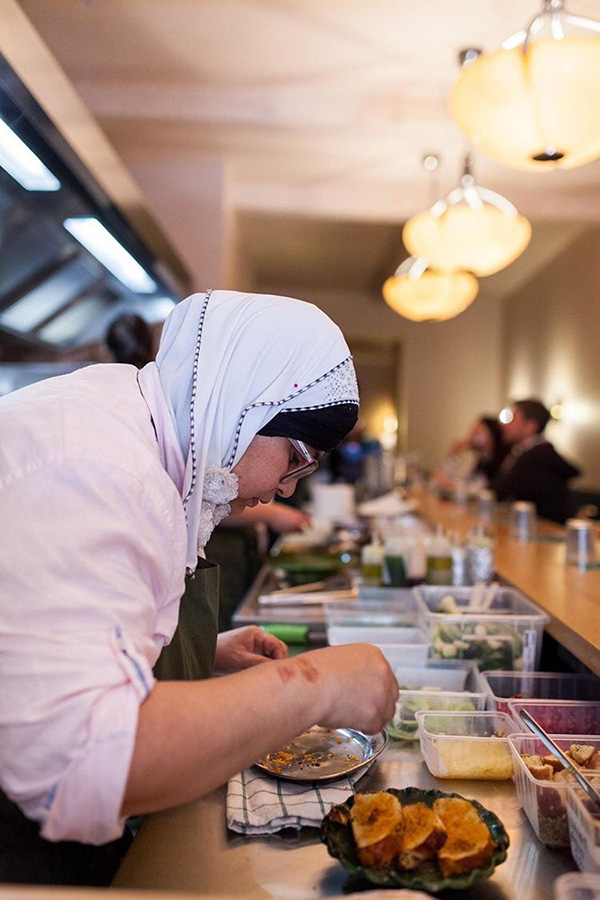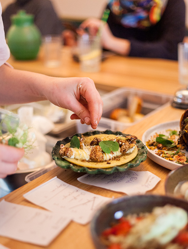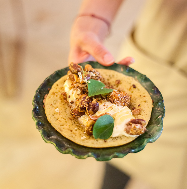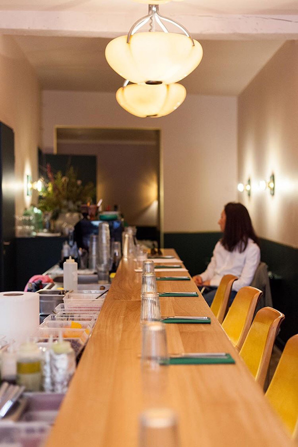 [dropcap text_color= » » background_color= »dark »]C[/dropcap]’est un bistrot très joyeux comme on en fait peu. Tout tourbillonne à l’intérieur, les clients, les assiettes, les serveurs et les citronnades parfumées. Derrière les fourneaux, uniquement des jeunes femmes, affairées mais gracieuses derrière le grand comptoir, où les habitués papotent à tout-va. Aux commandes, Ella Aflalo, déjà remarquée lors de sa table éphémère l’an dernier chez Jogging. La ravissante cheffe a le don des associations et le sens des couleurs. Ses plats sont des tableaux débordant de saveurs mais on s’en amuse vraiment. Et surtout, c’est bon ! On se délecte des beignets de piments verts et la patate douce rôtie fait son effet. La cuisine pratiquée ici est celle-là même que l’on déguste dans les bons restaurants de Tel-Aviv ou au Balagan, adresse très courue du tout-Paris. L’exotisme est donc au rendez-vous dans la rue d’Aubagne, côté Noailles, qui n’en manquait déjà pas…